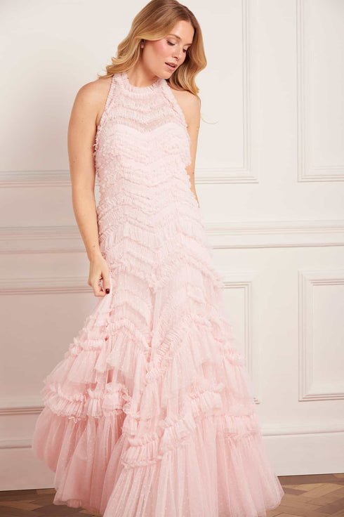NEW SEASON. The Elia Halter-Neck Gown in Seashell. A modern classic, designed with a halter neck and frothy signature Needle & Thread tulle ruffles. This gown drapes beautifully for an understated yet captivating evening look.