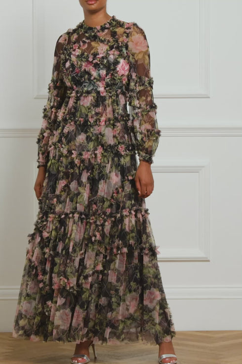 The English Rose Diamond Ruffle Gown in Graphite. This gown is inspired by a traditional rose print taken from a 1900s hand-painted artwork, in soft hues of deep pinks. Developed with signature Needle & Thread styling featuring perfectly engineered frills for all-over delicate texture. The perfect gown to take you from dinner to the dancefloor.