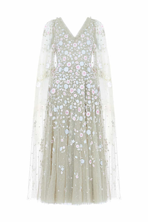 NEW SEASON. The Ethereal Blooms Cape Sleeve Ankle Gown in Aloe/Multi. Features delicate floral embroidery inspired by vintage archive prints. Crafted from flowing tulle, the gown is designed with soft cape sleeves and a romantic A-line skirt, creating a light, graceful finish.
