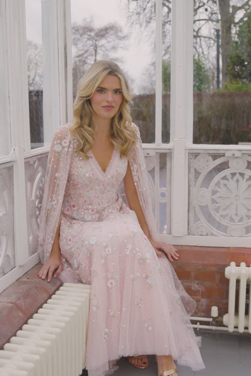 NEW SEASON. The Ethereal Blooms Cape Sleeve Ankle Gown in Seashell/Multi. Embellished with trailing floral embroidery inspired by early 1900s archive prints. Designed with ethereal cape sleeves and a softly flared tulle skirt, it creates a beautifully light and romantic impression.