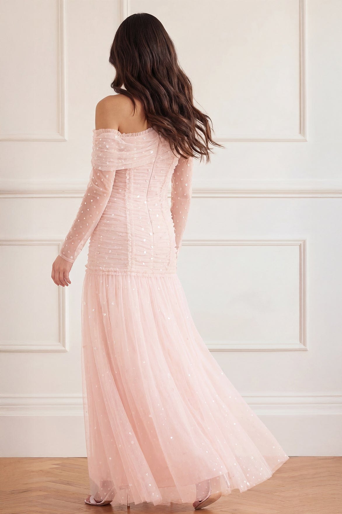 NEW SEASON. The Gigi Dot One-Shoulder Rouched Gown in Cream/Peony Pink. Featuring a playful yet elegant dot design, balanced by a striking one-shoulder silhouette. Finished with flattering ruching through the body, this gown creates a softly sculpted shape for modern occasionwear.