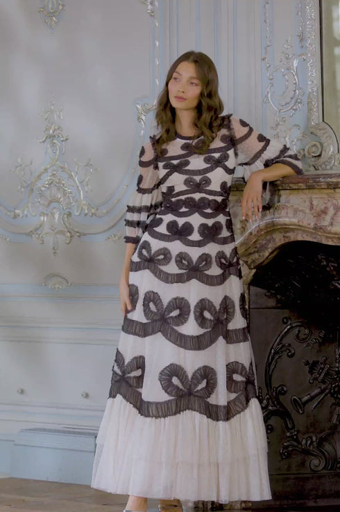 The Ingrid Gown in Cream / Graphite. This iconic Needle & Thread style is inspired by vintage ribbon bows. Beautifully engineered with delicate tulle and subtle texture to capture this ribbon motif. This signature Needle & Thread monochrome gown is bold yet truly romantic.