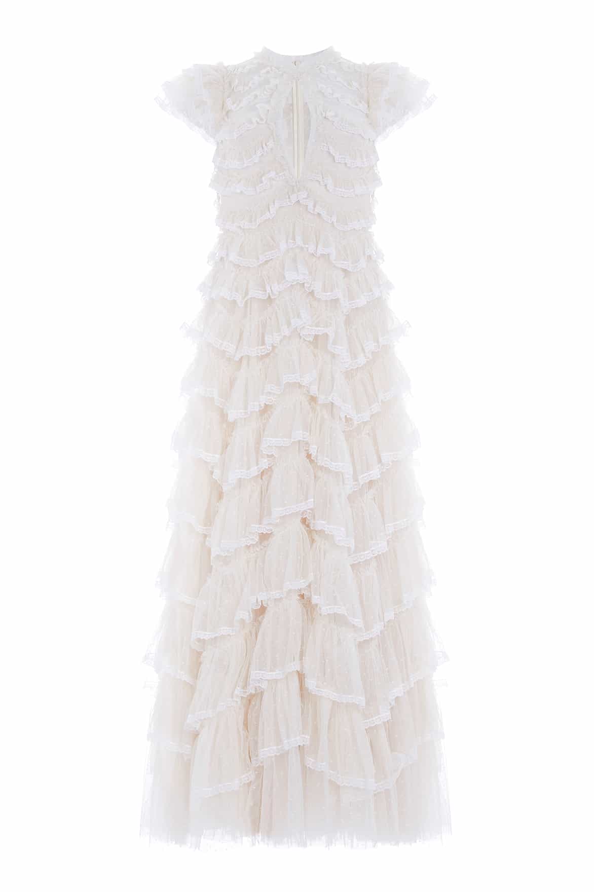 The Libby Lace Gown in Cream. A new statement piece for the season ahead. Beautifully adorned with gathered tulle frills in soft zig-zag borders and delicate lace trims for intricate, signature detailing. Developed with layers of tulle to create frothy textured sleeves and a keyhole neckline for a romantic look. Expect all eyes on you in the Libby Lace.