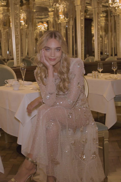 The Papillon Sheer Ankle Gown in Parchment, inspired by the 1900s French ballet La Papillon, features glittering butterfly motifs that trail delicately towards the hem. Decorated with high-shine sequins, enhanced with a glossy foil coating, add extra lustre. This sheer gown includes an integrated stretch scoop-neck bodysuit and slim sleeves adorned with butterfly and glittering dot motifs. The round neckline is finished with signature Needle & Thread tulle frills. Make a statement in this enchanting showstopper.