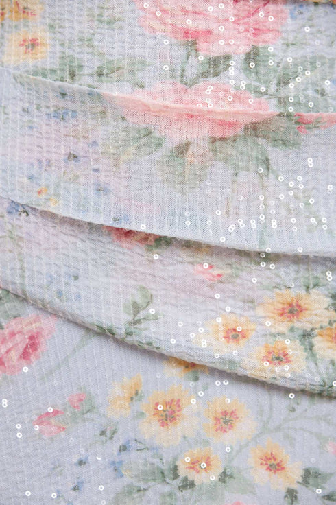 The Pompadour Garden Sequin Gown in French Blue. Inspired by the opulent wall coverings of the Palace of Versailles, this gown features luxurious hand-painted floral bouquets and trailing ditsy motifs. Crafted with tiny clear sequins delicately applied for a transparent, shimmering effect. The slim silhouette is beautifully draped, flattering the body, while the fluid, sweeping skirt adds movement. Short sleeves complete the refined, elegant look, making this gown a true statement of luxury and craftsmanship.