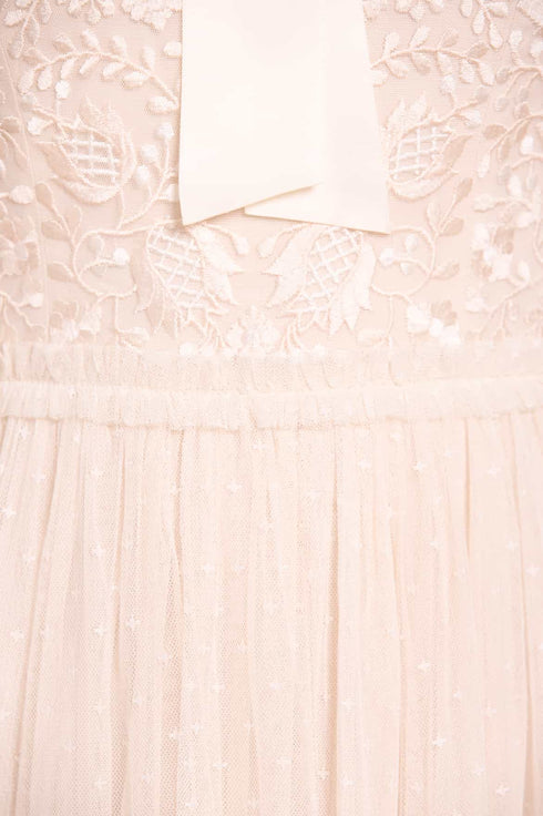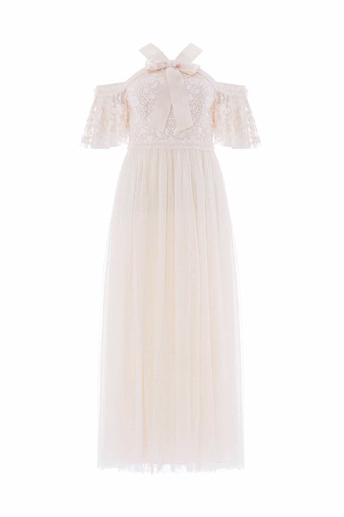 The Primrose Bodice Ankle Gown in Cream. This gown features delicate tonal embroidery on the bodice, inspired by antique lace. Designed with satin ribbon straps and a bow elegantly accent the neckline, while cold shoulder detailing and romantic fluted sleeves add a feminine touch. The skirt, crafted from layers of soft Needle & Thread tulle, creates a dreamy, romantic silhouette. A versatile gown perfect for any occasion.