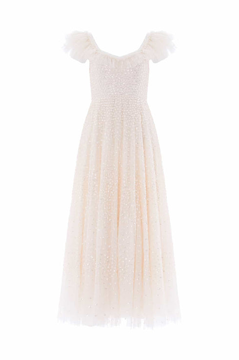 The Scatter Dot Ruffle Ankle Gown in Cream. This gown features shimmering dot motifs that fade towards the hem for a captivating glittering effect. The sequins have a high-shine finish, enhanced by a foil coating. Designed with a tulle frill edge on the neckline, while layered tulle sleeves add volume. The voluminous skirt, made from net and tulle, creates a sweeping hemline. This enchanting gown is perfect for any special occasion.