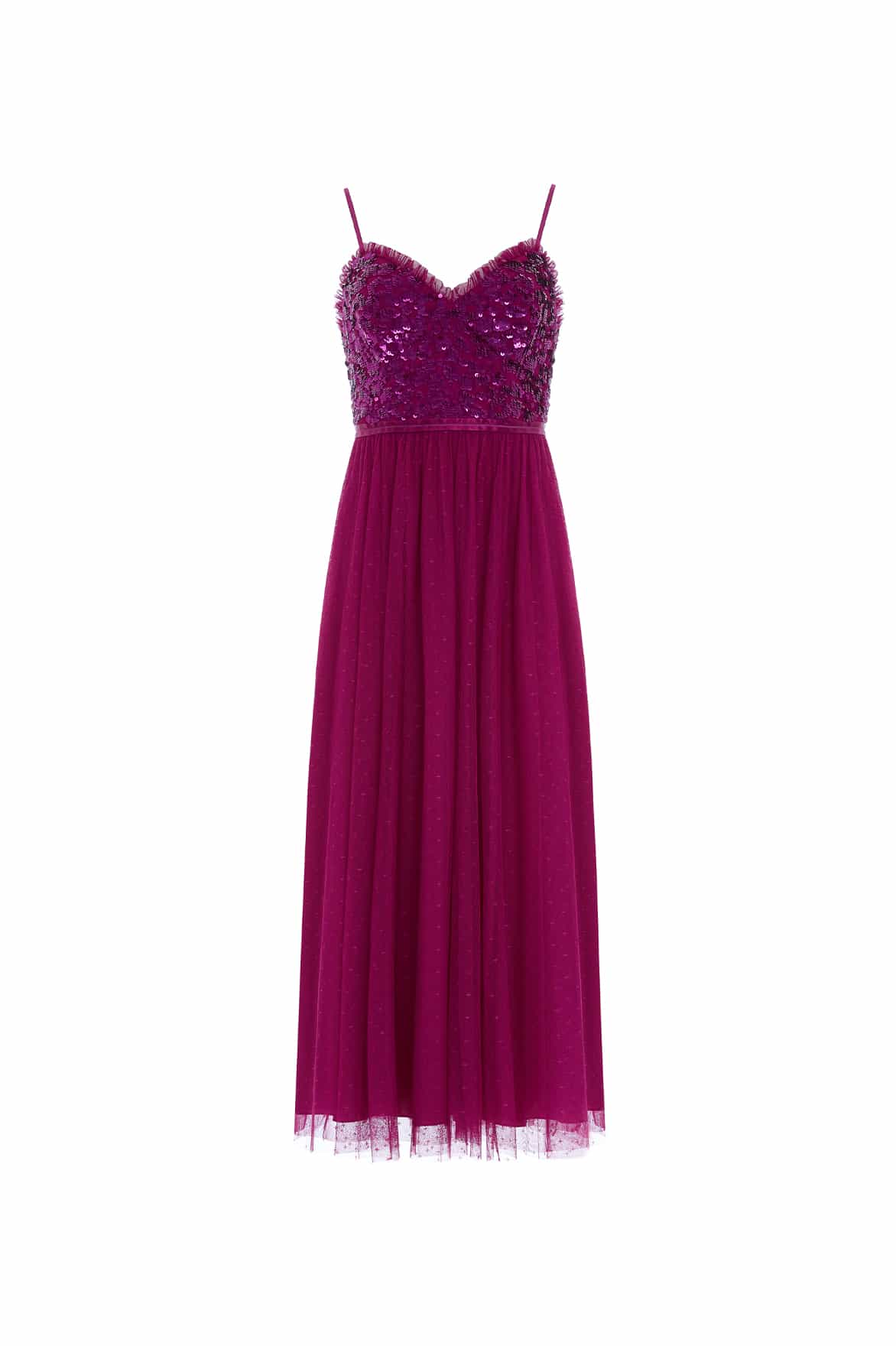 The Tempest Bodice Cami Ballerina Dress in Plum. This ballerina length dress is inspired by a vintage lace tablecloth design, embellished with shimmering sequins all over the bodice. Designed with cami sleeves, a layered tulle skirt with an 'x' motif and frill trim detailing around the neck. Make an entrance in the Tempest.