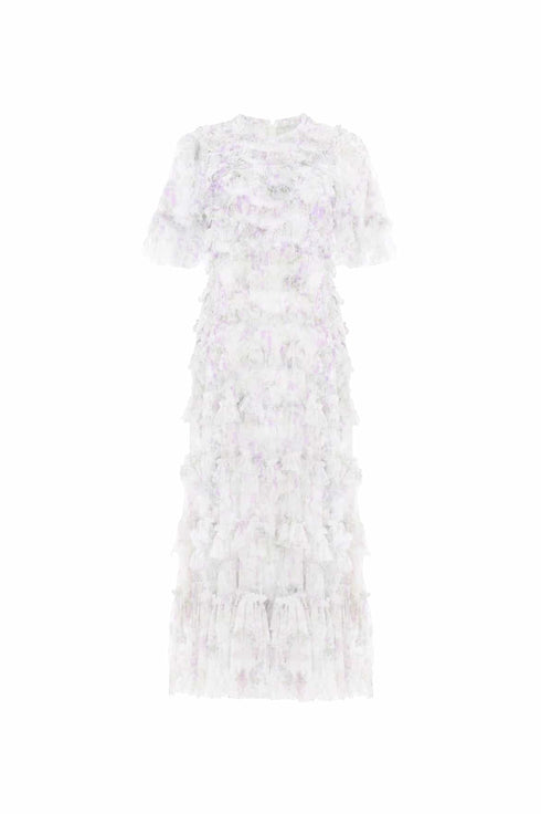 NEW SEASON. The Trailing Floral Round Neck Ballerina Dress in Moonshine/Powder Lilac. This romantic ballerina-length dress is adorned with trailing floral artwork inspired by painted garden scenes. Finished with a round neckline and softly flowing skirt for light, feminine movement.