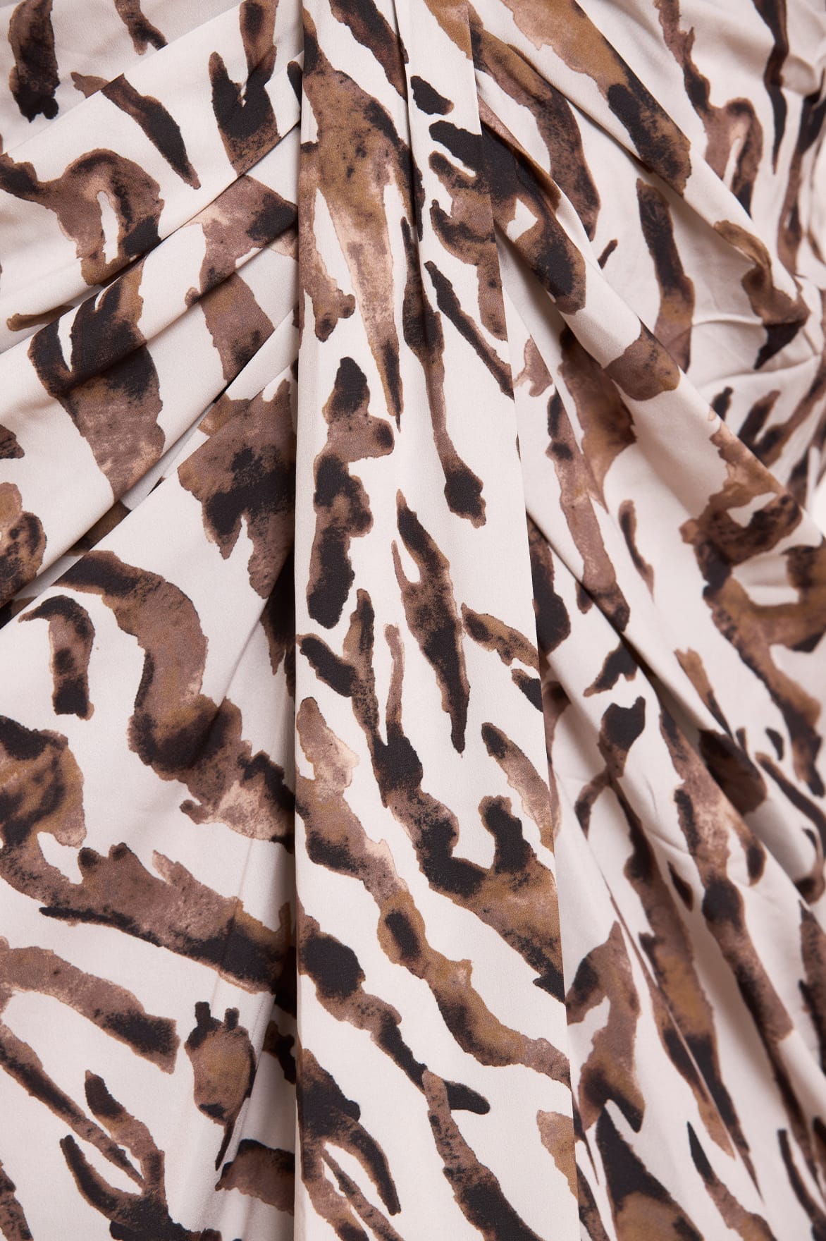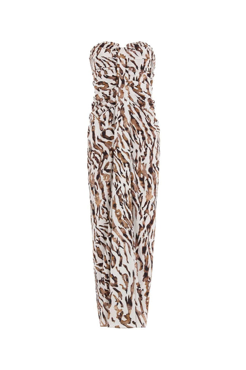 The Zebra Crepe Strapless Ankle Gown in Moonshine. This zebra print gown blends Hollywood glamour with hand-painted, water-inspired artwork. Crafted in soft crepe, it features elegant draping, flattering ruching, and a frilled neckline. An internal stretch power-mesh corset ensures comfort and impeccable fit, enhanced by couture-level details like grosgrain-encased boning. Pair it with the Zebra Chiffon Long Cape for a truly show-stopping look.