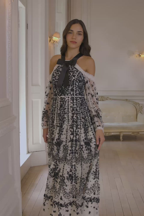 The Adeline Off-Shoulder Ankle Gown in Cream/Graphite. A dramatic take on evening elegance. Delicately embroidered with Victorian-era inspired florals, bows and scallops in contrast graphite thread, this off-shoulder silhouette embraces romance with a contemporary twist. Shimmering sequin embellishments enhance the flattering fitted bodice, while the ankle-length skirt flows into a cascade of softly glinting florals.