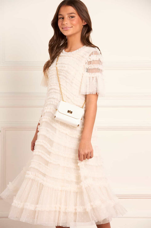 NEW SEASON. The Amara Ruffle Kids Dress in Cream. A timeless design with layers of soft ruffles. Crafted for comfort and charm, this dress offers a graceful silhouette perfect for birthdays and family gatherings.