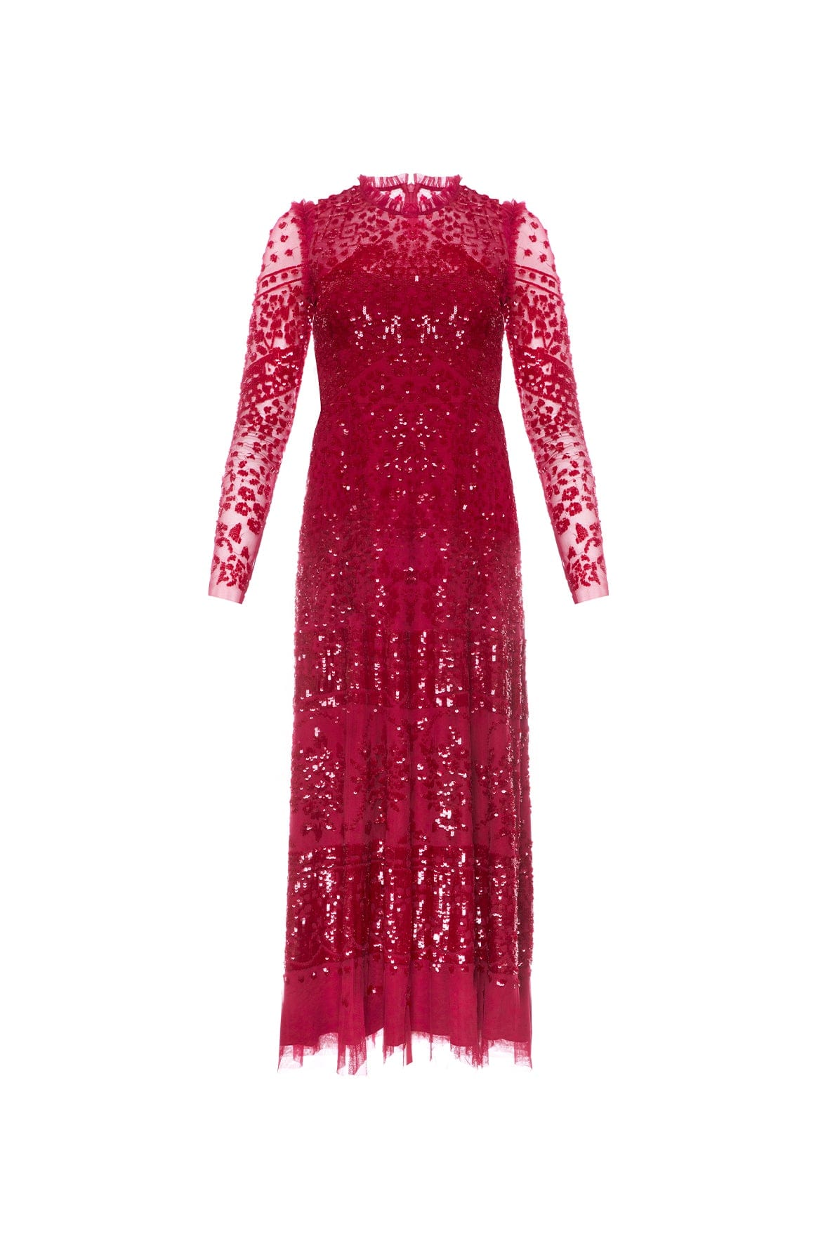 NEEDLE & THREAD EXCLUSIVE. The Aurora Ballerina Dress in Cherry Red. This light-catching ankle-length dress is decorated with red shimmering sequins, and was inspired by a vintage lace tablecloth. The Aurora Ballerina is a long-sleeve dress with pretty floral elements, and a flattering silhouette. There is delicate frill lace detailing around the neck and arm for further intrigue. Style yours with an on-trend hair ribbon for the perfect look.