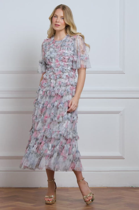 - Floral printed tulle decorated with layers of tulle ruffles.