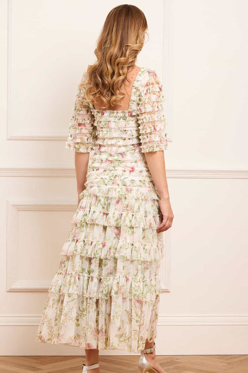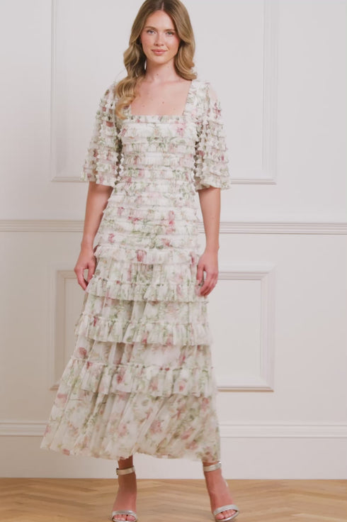 The Colette’s Rose Short Sleeve Ankle Gown in Moonshine. This beautiful dress is adorned with our vintage wallpaper-inspired rose print. The hand-painted florals are framed in soft diamond formations and gently fade across the tulle base. Short sleeves, delicate trims and a floaty ankle-length skirt create a beautifully timeless silhouette.