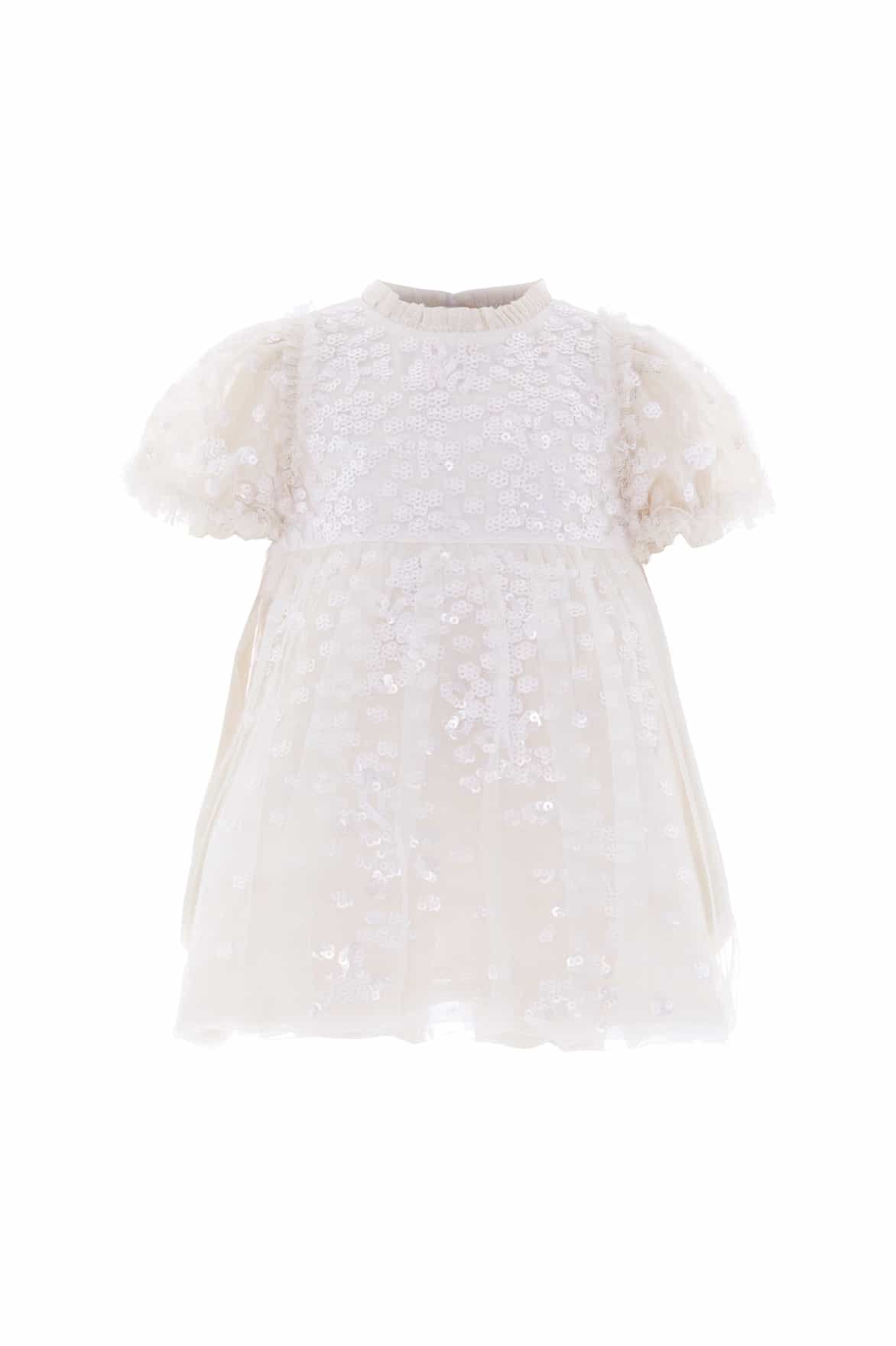 The Confetti Baby Dress in Cream. This pretty design features sequin-embellished flower motifs that cascade down the dress in a confetti pattern. The puffball skirt is crafted from soft, gathered mesh, while the tulle frills on the neckline and shoulders add a delicate touch. Developed with short puff sleeves finished with ruffled cuffs, and the dress is lined in luxurious cotton voile for comfort. Complete with coordinating cotton dobby bloomers, edged with frills. Let your little one shine in the spotlight.