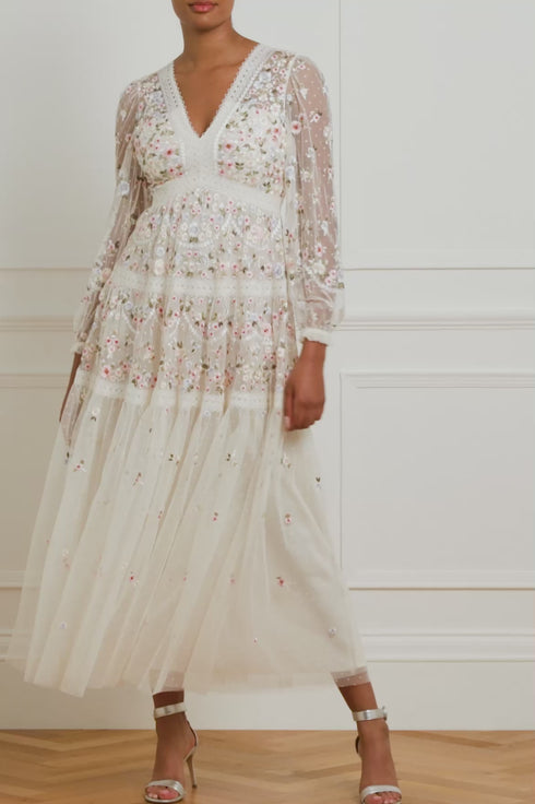 The Garland Ribbon Ankle Gown in Cream This embroidered gown is inspired by Victorian lace trims. Beautifully designed with floral embroidery in soft pastel tones. Developed with a V-shaped waist seam to create a flattering, effortless fit. This gown is adorned with intricate lace trims for signature Needle & Thread detailing. A pretty piece you'll forever treasure.