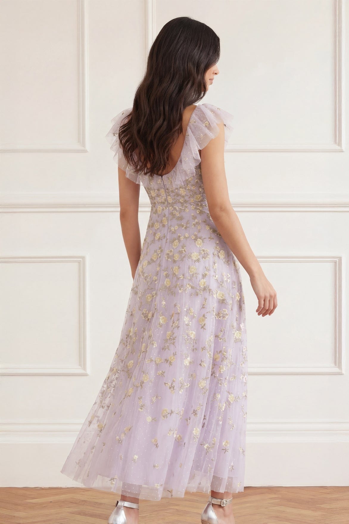 NEW SEASON | NEEDLE & THREAD EXCLUSIVE. The Lea Ditsy Ankle Gown in Powder Lilac/Lemon Sorbet. This elegant gown is adorned with delicate ditsy florals inspired by early 1900s garden paintings. Designed with a flowing ankle-length silhouette, trailing leaves and soft florals create a timelessly romantic effect.
