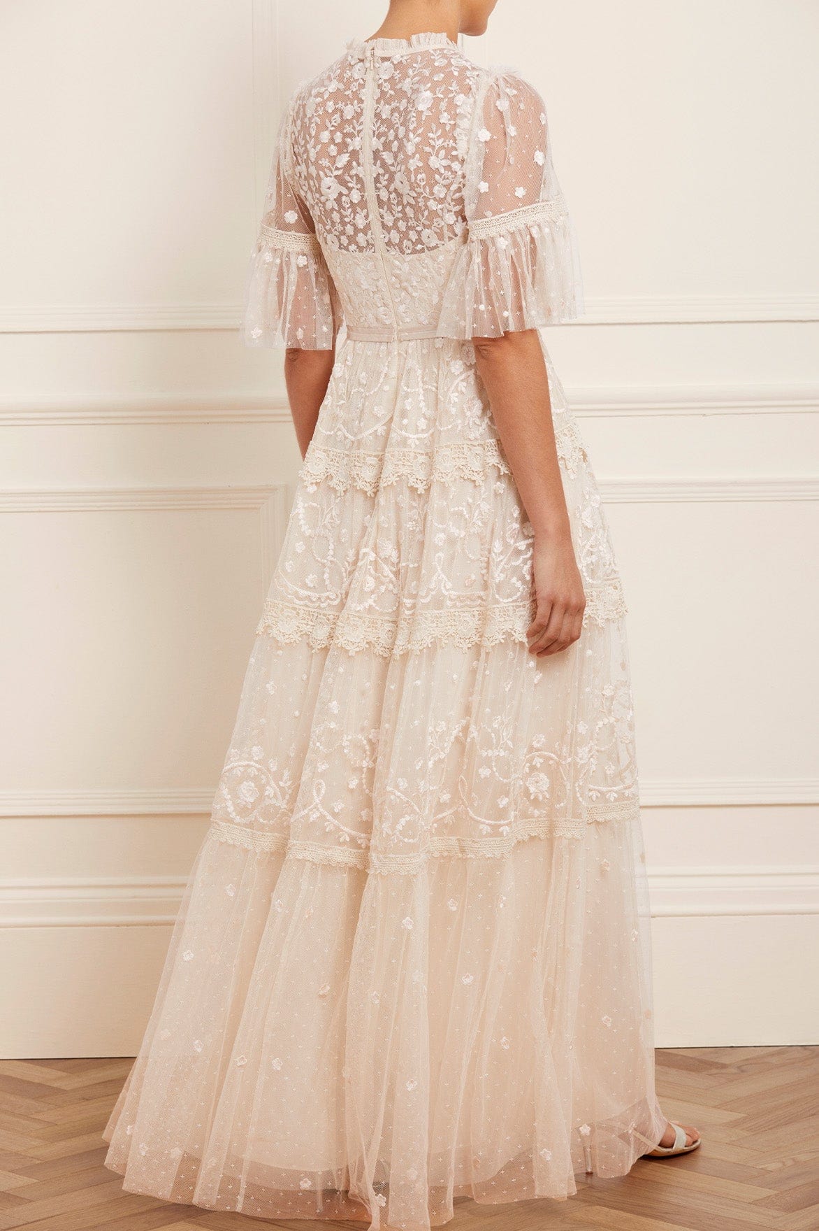 The Midsummer Lace Round Neck Gown in Champagne. A signature Needle & Thread style, with an updated neckline for the Taking inspiration from Victorian lace, the Midsummer features intricately embroidered artwork in tonal colours on delicate tulle. Beautifully developed with lace frills framing each tier of the skirt. This embroidered lace gown has sheer, romantic sleeves and our signature grosgrain ribbon at the waist. The perfect gown to take you from day to night.