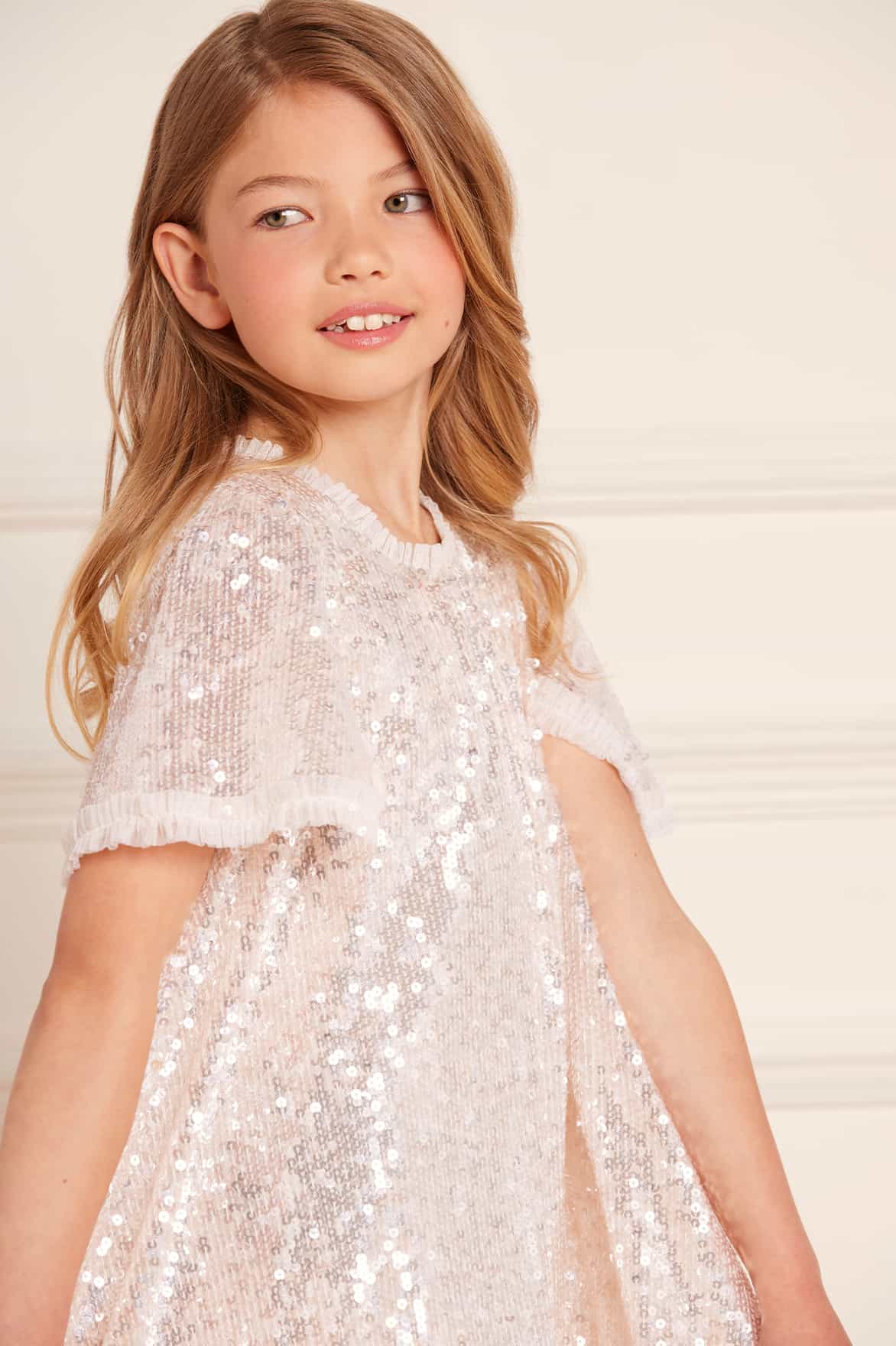 NEW SEASON. The Mila Gloss KIDS Dress in Cream. This statement dress is beautifully embellished with lustrous sequins, creating an all-over shimmering effect. Developed with an easy-to-wear yet playful trapeze silhouette and a voluminous skirt. Let your little one shine at their next event in the Mila Gloss.