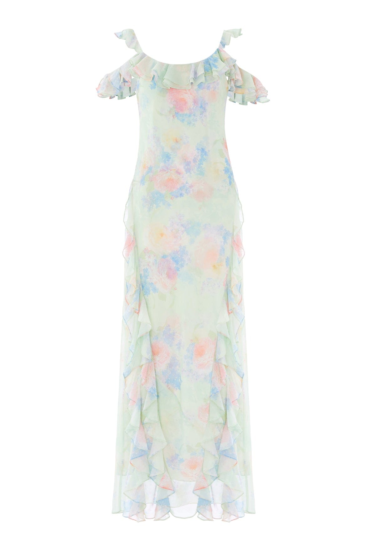 NEW SEASON. The Peony Bloom Georgette Cami Gown in Peppermint. Featuring a signature floral print inspired by an early 1900s hand-painted wallpaper, this gown showcases romantic peony bouquets and trailing daisies. Cut on the bias for a fluid drape that effortlessly skims the body, finished with a delicate cami silhouette.
