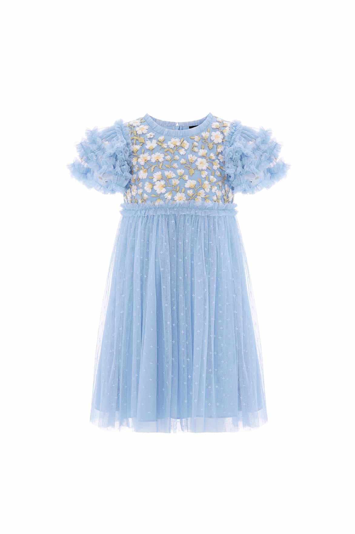 NEW SEASON. The Posy Bodice Kids Dress in Sky Blue/Cream features a 1930s-inspired print with posies and vintage embroidery. Crafted in soft tulle with a relaxed trapeze silhouette and a smocked yoke panel, this easy-to-wear style is a new season favourite. Perfect for any upcoming special occasion.