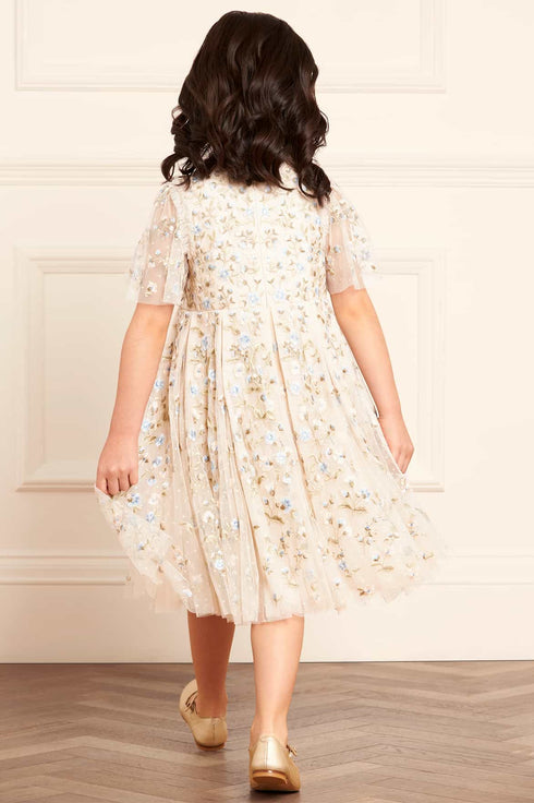 The Posy Pirouette KIDS Prom Dress in Cream / Blue. A brand new statement style for this season. Beautifully designed with intricate, rich embroidered artwork inspired by our ‘summer posy’ print. Developed with posy florals scattered all over and dispersing towards the hem, creating a pretty embroidery design. The skirt is made from generous layers of net and tulle, creating a sweeping hemline. The perfect dress for all their upcoming special events.