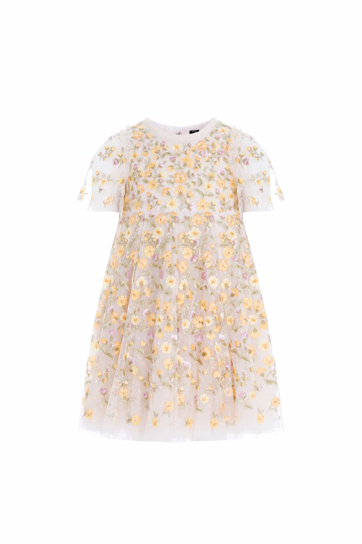 The Posy Pirouette Kids Prom Dress in Cream showcases intricate embroidery inspired by the ‘summer posy’ print, with delicate florals scattered across the bodice and flowing towards the hem. The generous layers of net and tulle create a sweeping, voluminous skirt, making it an ideal choice for special occasions.