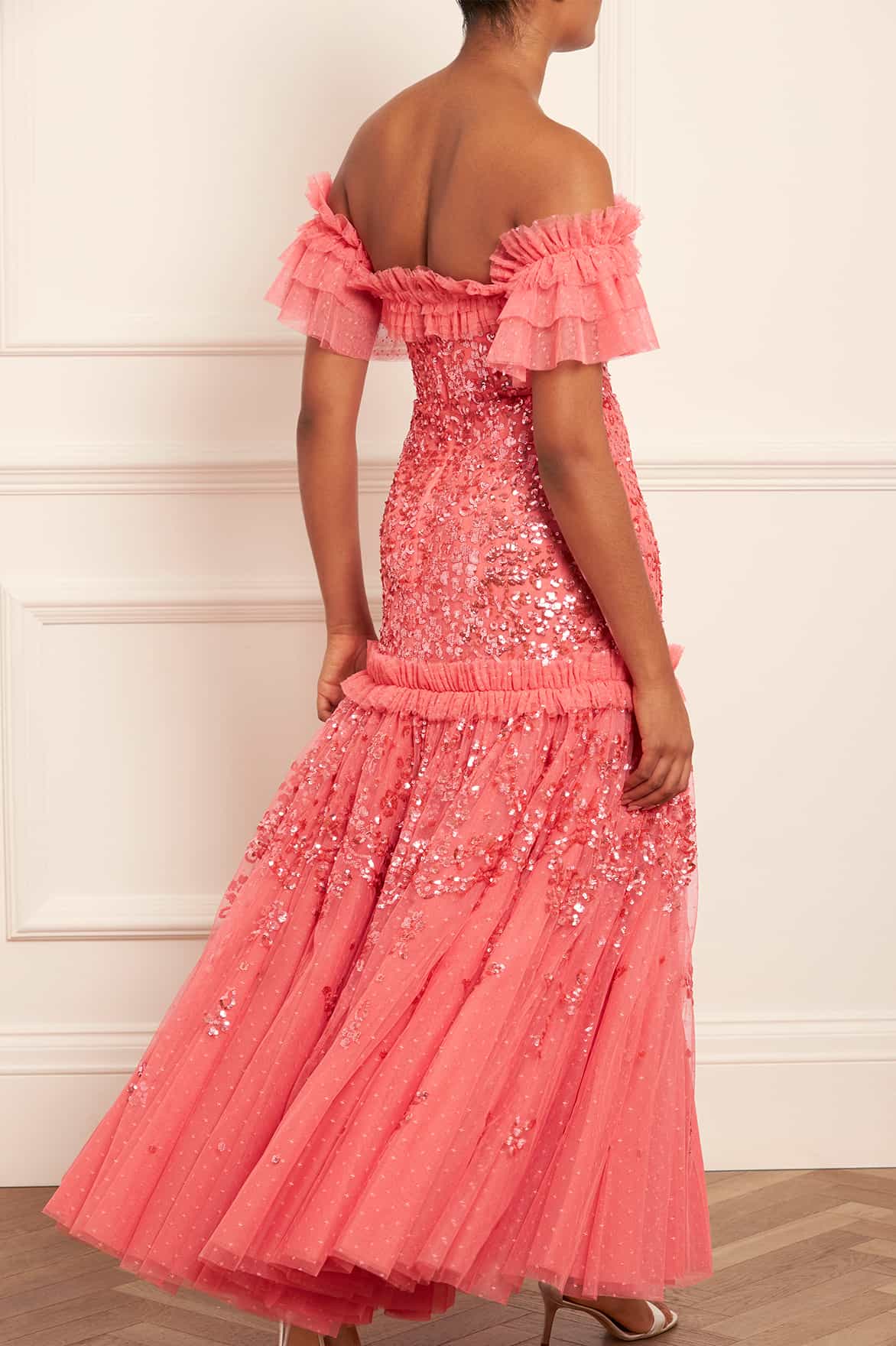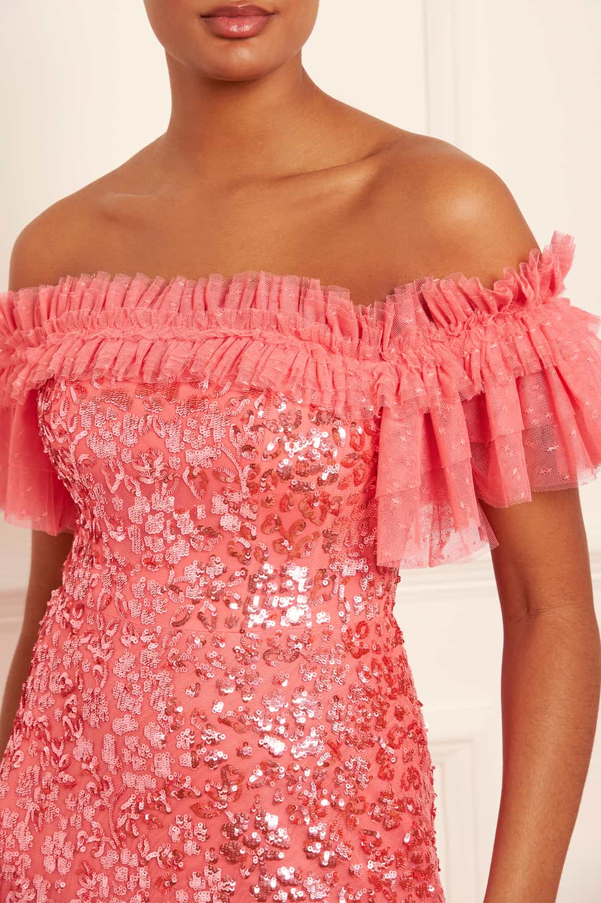 The Regal Rose Off-Shoulder Gown in Pink Sky. A season favourite with an off-shoulder design for the season ahead. This statement gown is developed with a fitted corset bodice flowing into a dramatic, voluminous skirt, creating impact as you walk. The Regal Rose is decorated with an elegant, floral artwork featuring delicate lace. This beautiful design is engineered with layers of our signature Needle & Thread tulle and net, adding a romantic texture. Engineered with an integrated corset made with ribbon stitching, soft boning and panels of stretch mesh fabric for comfort and security in the fit. Take centre stage in this show-stopping piece.