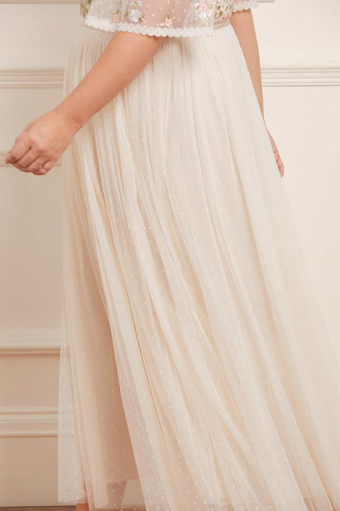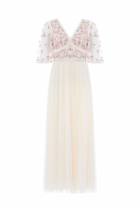 The Ribbon Bouquet Bodice Ankle Gown in Champagne / Pink Multi. The bodice of this gown is intricately designed with embroidered bouquets of flowers in rich tones, inspired by a 1930s vintage print. Beautifully adorned with delicate lace trims for signature Needle & Thread detailing. The skirt features layers of tulle to create a romantic silhouette. The perfect gown for an upcoming occasion.