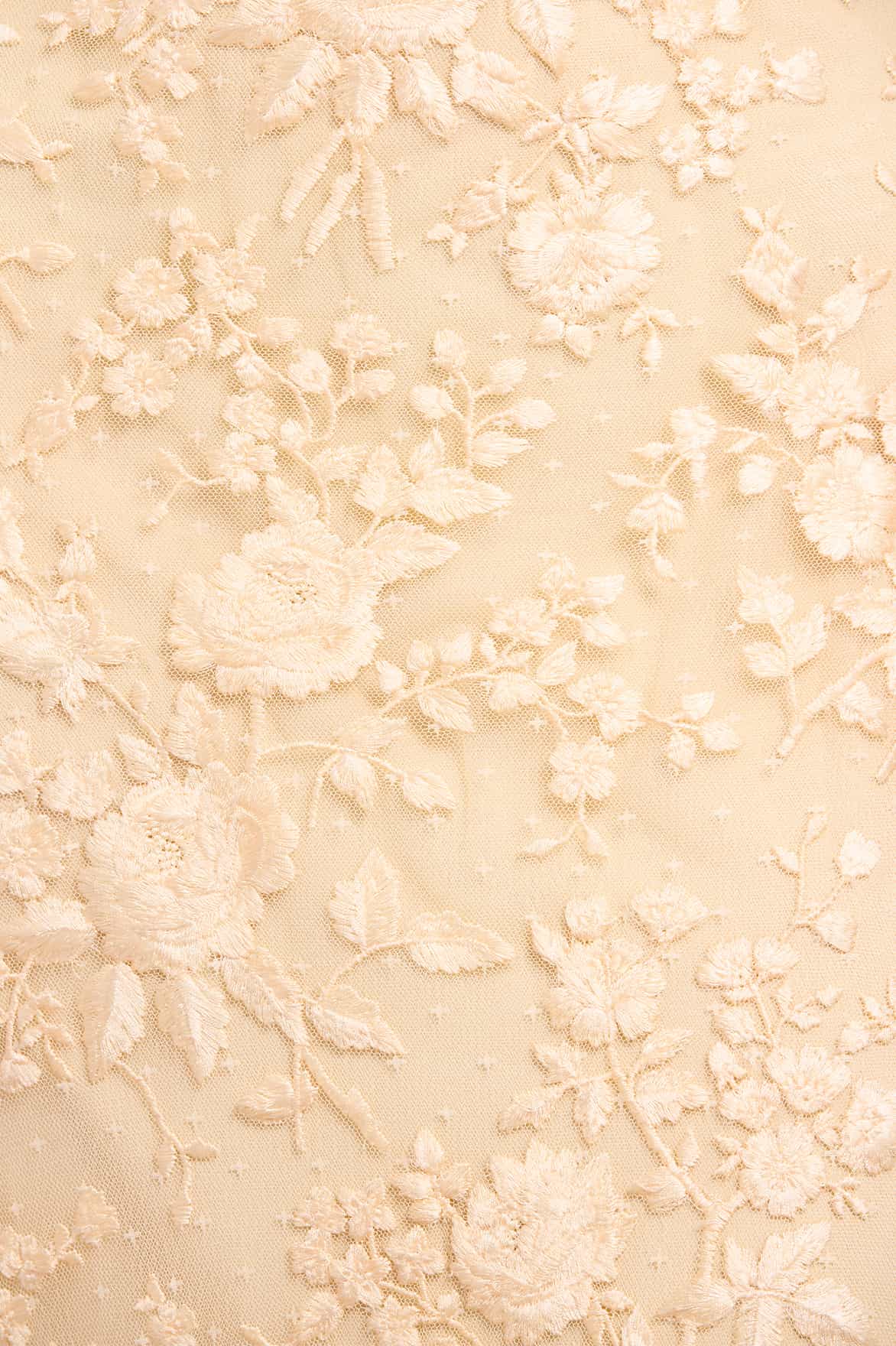 NEW SEASON. The Rosa V-Neck Cape Gown in Lemon Sorbet. This elegant gown features signature floral embroidery inspired by romantic garden landscapes. Designed with an integrated cape and a slim silhouette, complemented by a bias-cut lining for a smooth, body-skimming fit and effortless wear.