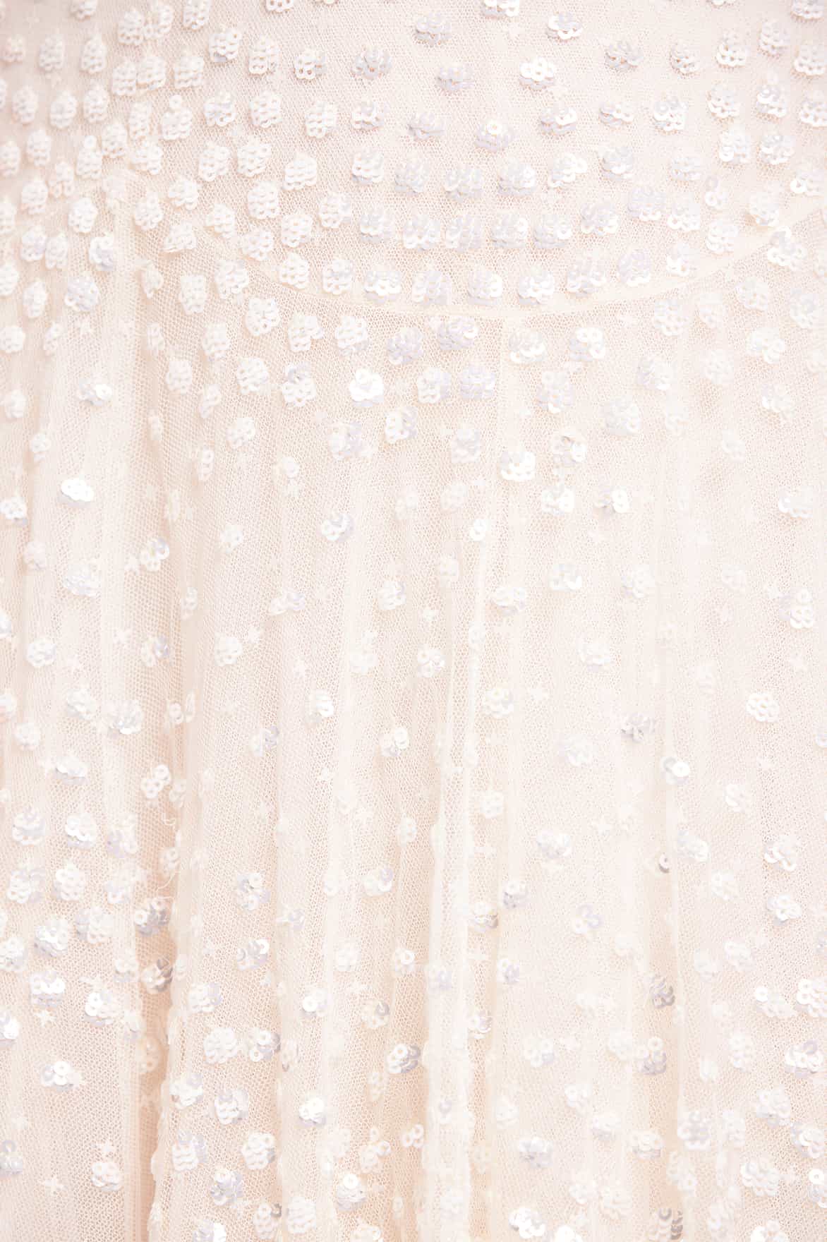 NEW SEASON. The Scallop Sequin V-Neck Ankle Gown in Cream. Decorated with glistening sequin clusters that gently fade toward the hem. Designed with a flattering V-neckline and flowing silhouette, this gown radiates elegance and soft luminosity.
