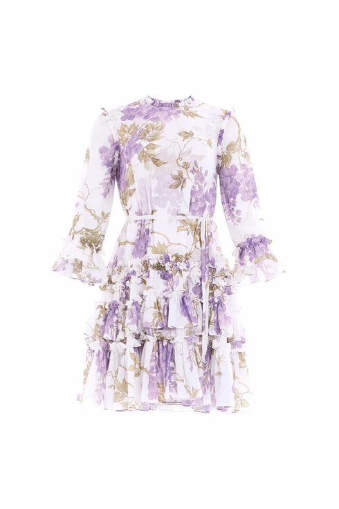 The Wisteria Chiffon Round Neck Mini Dress in Moonshine. This romantic dress is inspired by an early 1900s hand-painted upholstery design. Beautifully printed with large wisteria florals in soft, muted tones, creating a statement design. Developed with a soft chiffon fabric and a loose-fitting silhouette for a floaty look. This dress is engineered with frills at the neckline and hem for a relaxed, signature Needle & Thread design. Make this style your new wardrobe staple.