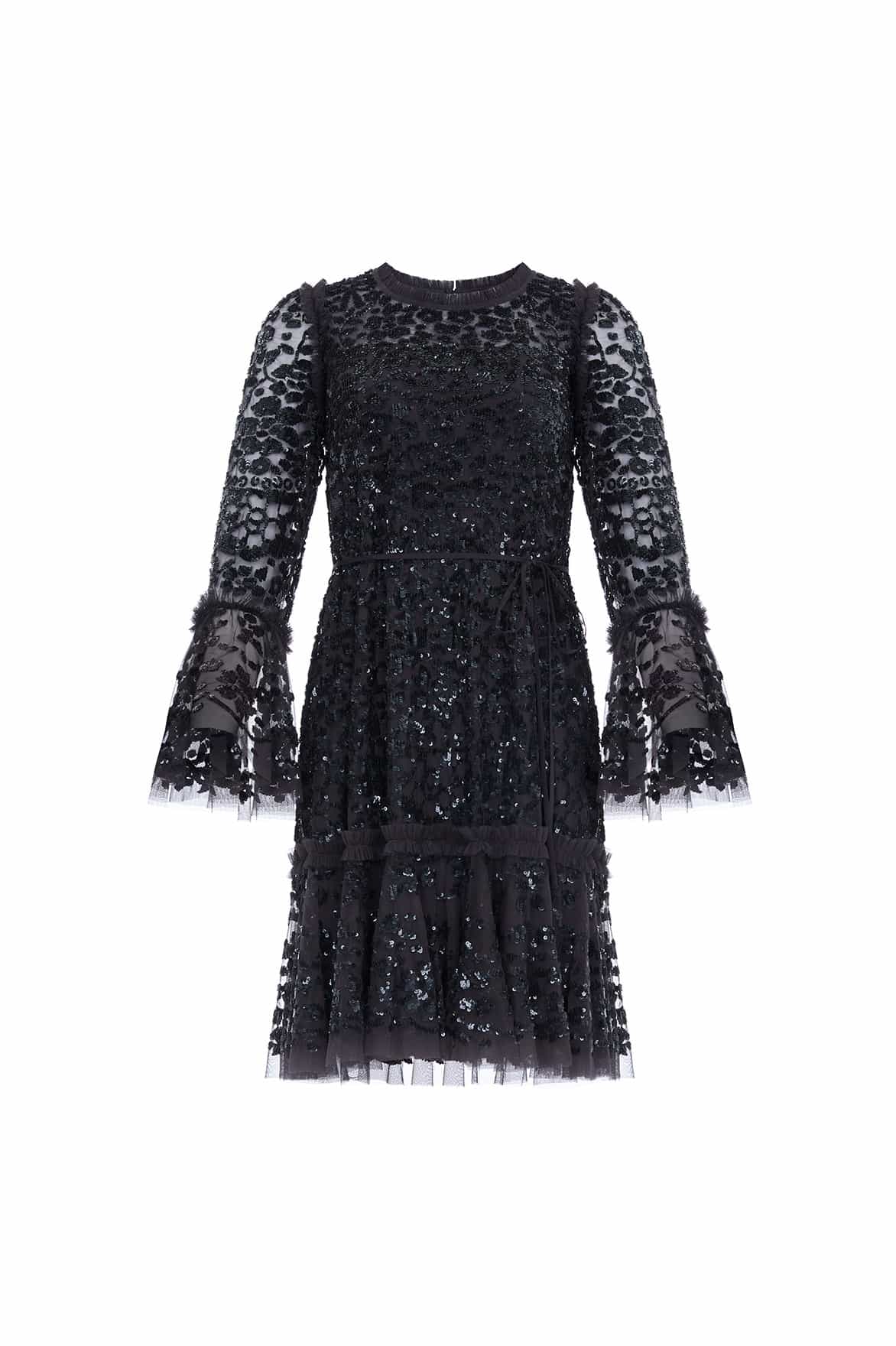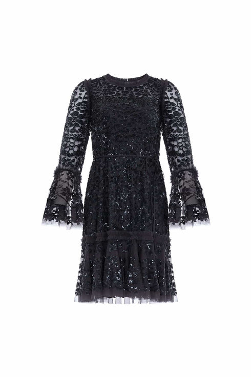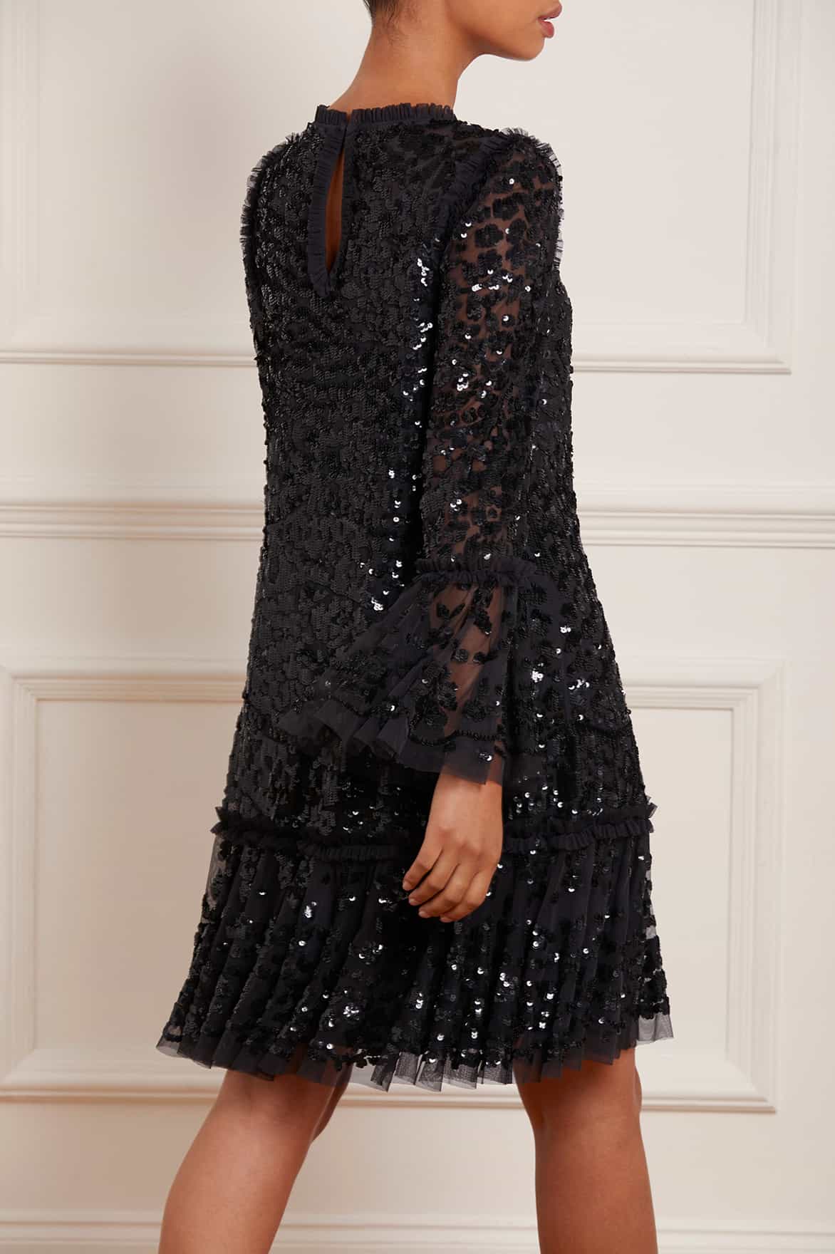 The Annie Sequin Tiered Mini Dress in Graphite. This mini dress is adorned with shimmering sequins in floral and bow artwork inspired by a lace tablecloth. Designed with a loose fit silhouette and tiered throughout, creating beautiful movement. Make an effortless statement in the Annie.
