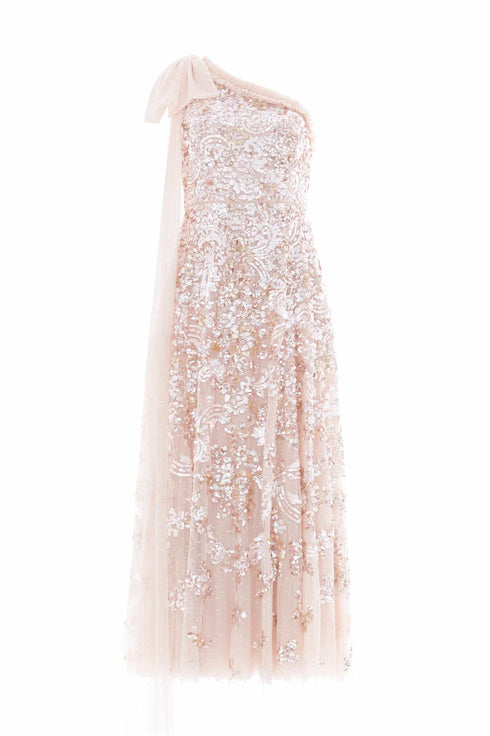 NEW SEASON. The Baroque Floral One-Shoulder Bow Ankle Gown in Oyster. A show-stopping piece with heritage drama, this gown draws on ornate 18th-century motifs reimagined in a modern silhouette. Designed with floral and scroll sequin embellishment, the asymmetrical neckline is adorned with a statement bow for couture-level impact. In soft oyster, this gown feels romantic, regal, and red carpet ready.