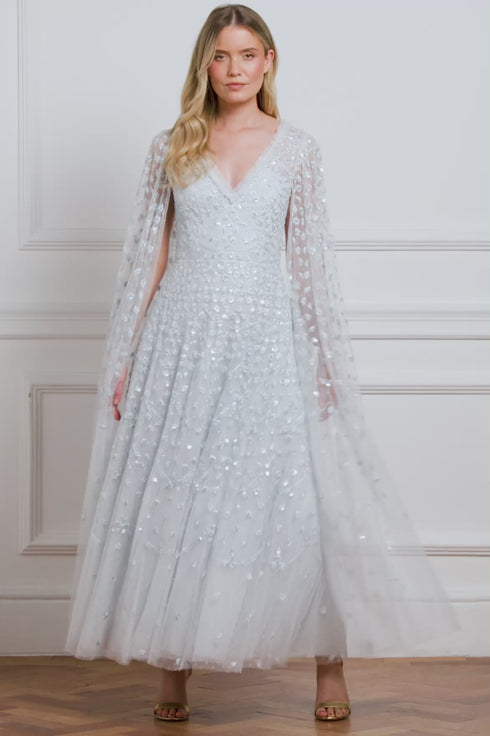NEW SEASON. The Clover Cape Sleeve Ankle Gown in Ice Blue. A romantic silhouette featuring a softly gathered cape sleeve. Crafted from delicate tulle, the gown drapes beautifully over the shoulders for an ethereal, graceful effect.