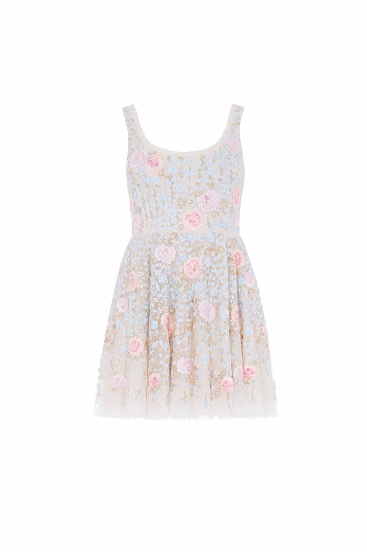 NEW SEASON. The Cressida Embroidery Scoop Neck Micro Mini Dress in Cream/Multi. Beautifully adorned with delicate floral motifs. Designed with a scoop neckline and layers of soft tulle, this playful silhouette brings a modern twist to classic Needle & Thread artistry.