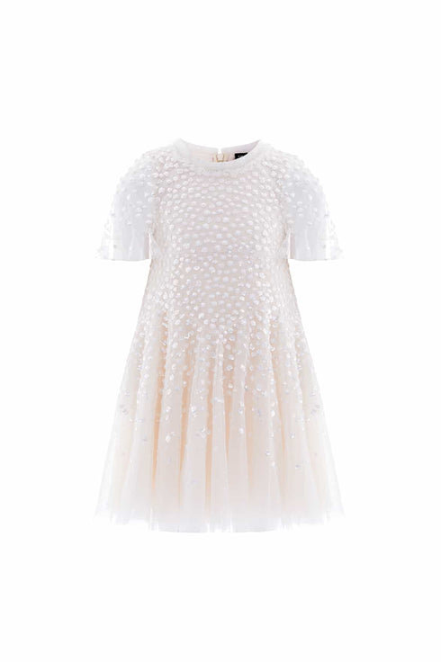 The Dappled Sequin Short Cape Kids Dress in Cream. This dress sparkles with shimmering dot motifs that twinkle and dance toward the hem, creating a delightful glittering effect. The playful cape with a frilly edge adds a touch of fairytale magic, while the chevron seaming on the skirt ensures a flattering, pretty fit. The voluminous tulle skirt, with its soft, layered fullness, sways beautifully—perfect for endless twirls and making every moment feel like a dream come true.