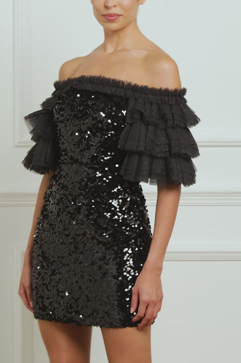 The Essie Off-Shoulder Micro Mini Dress in Graphite. This playful dress is crafted with an off-shoulder design. Beautifully decorated with frothy layered sleeves in soft, delicate tulle. Designed with a slim silhouette, in a micro mini length, decorated with glittering sequins for a shimmering, luxe look. The perfect party dress you'll wear time and time again.
