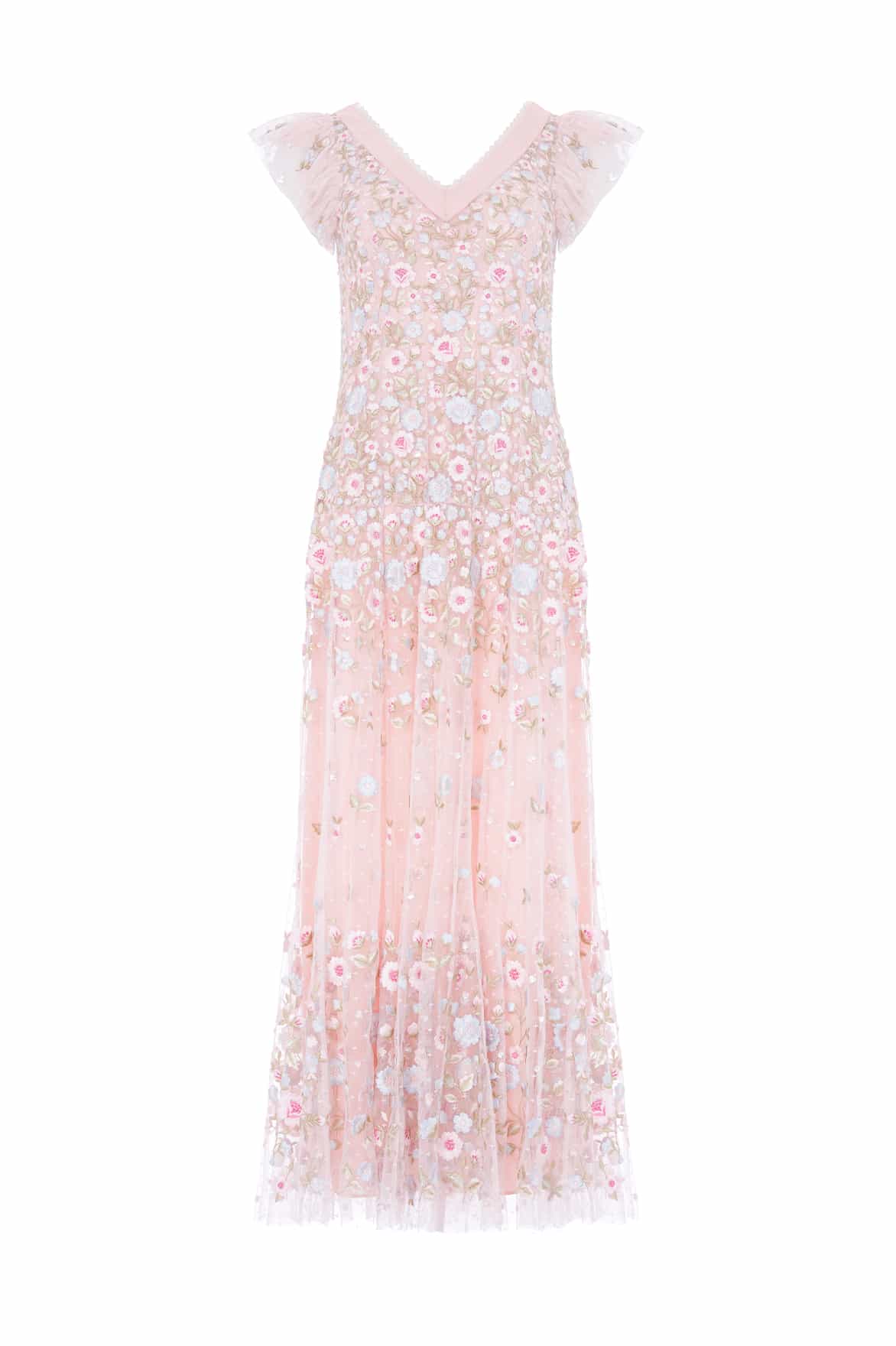 NEW SEASON. The Ethereal Blooms Short Sleeve Ankle Gown in Seashell/Multi. Showcases exquisite trailing floral embroidery in soft pastel tones. Cut with a fitted bodice and gentle A-line skirt, the design creates a light and romantic impression, perfect for evening occasions.