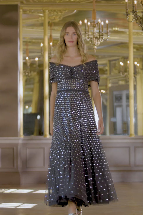 The Grace Gloss Off-Shoulder Ankle Gown in Graphite / Silver. This gown is beautifully decorated with high-shine sequins in dot motifs creating an enchanting, shimmery effect. Crafted with an off-the-shoulder design inspired by iconic Grace Kelly, capturing the elegance of her look perfectly. Designed with an integrated corset for the perfect shape and structure. You'll forever treasure the Grace Gloss.