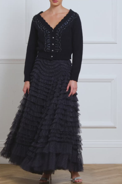 NEEDLE & THREAD EXCLUSIVE. The Hattie Ruffle Skirt in Navy. This textile skirt is engineered with layers of soft tulle and net to create a signature Needle & Thread style. Crafted with individual ruffles to create a beautiful, frilly texture. Designed with a sweeping hemline and finished at the waist with a satin ribbon for extra detail. We recommend pairing this skirt with our knitwear for a romantic Needle & Thread look.