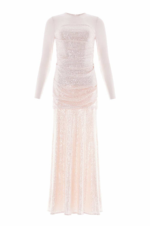 NEW SEASON. The Josephine Long Sleeve Gown in Oyster. Capturing the collection’s celestial shimmer, as if bathed in moonlight. Thousands of sequins are delicately stitched onto stretch mesh, creating a glittering surface that shifts with movement, like starlight scattered across water. The fluid hemline and powermesh sleeves balance sparkle with softness, while the oyster tone offers timeless refinement. A gown that feels both modern and eternal.