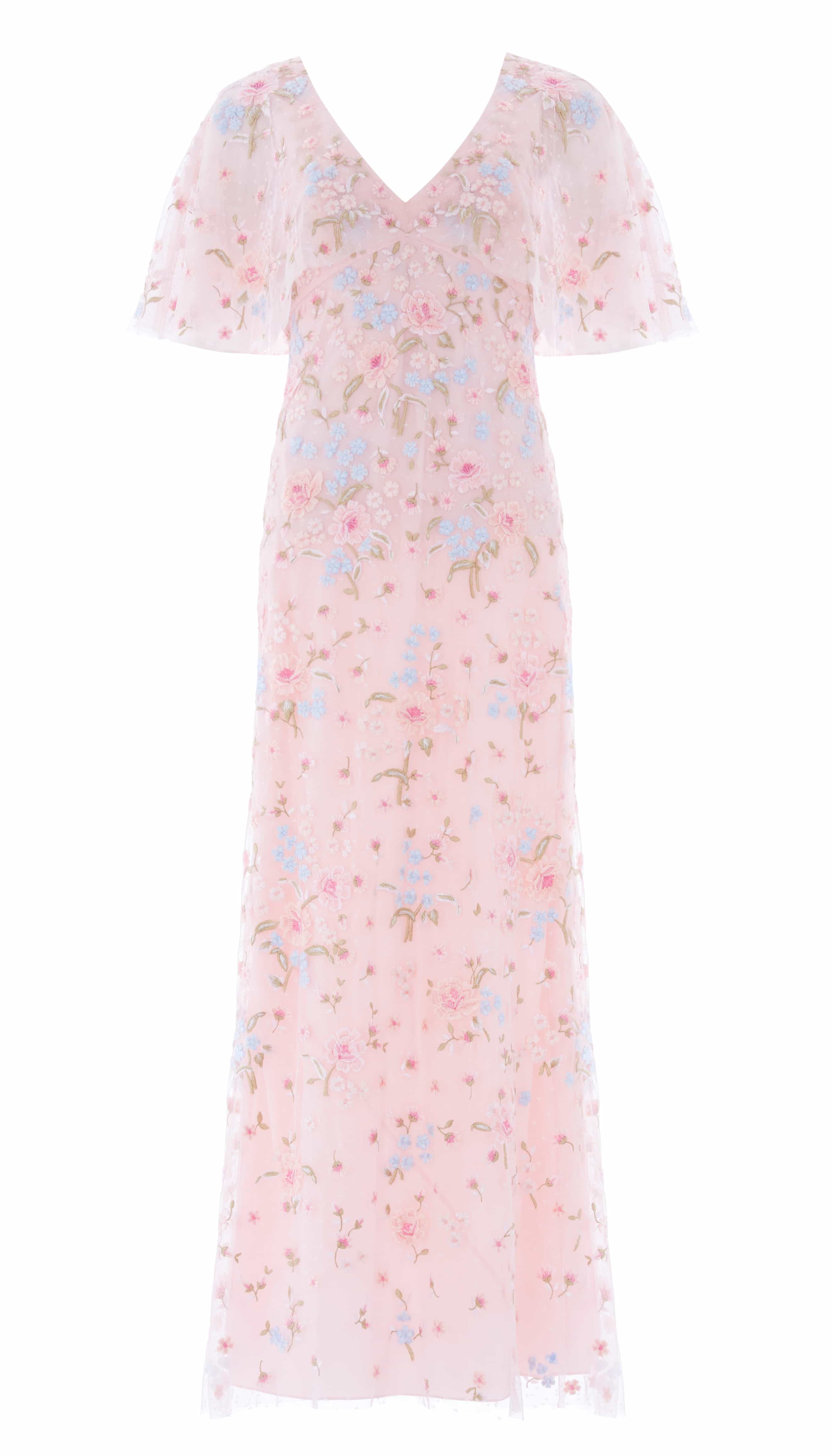 NEW SEASON. The Peony Bouquet V-Neck Cape Gown in Peony Pink/Multi. Romantic floral embroidery cascades across this gown, inspired by antique botanical artwork. Finished with an integrated cape and a slim silhouette, with a bias-cut lining for fluid movement and refined occasionwear styling.