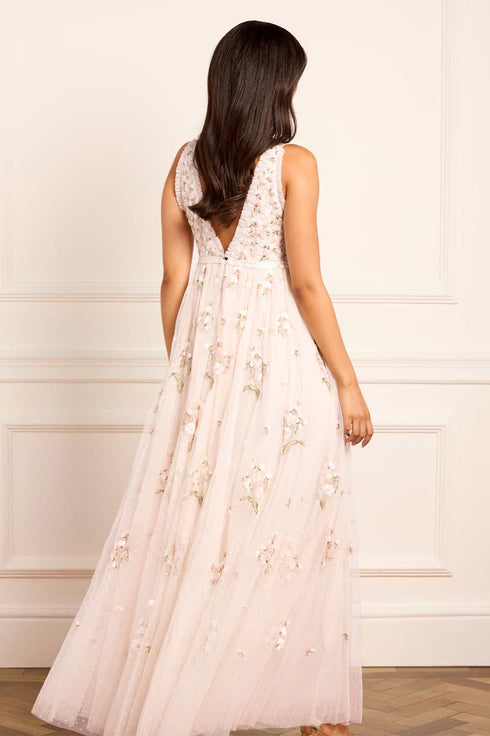 The Posy Bodice Cami Gown in Cream. The bodice of this gown is adorned beautifully with clusters of intricate floral bouquets and shimmering sequins for a sparkling effect. The skirt is developed with layers of signature Needle & Thread soft tulle for a romantic look. A simple but yet striking gown you'll forever treasure.