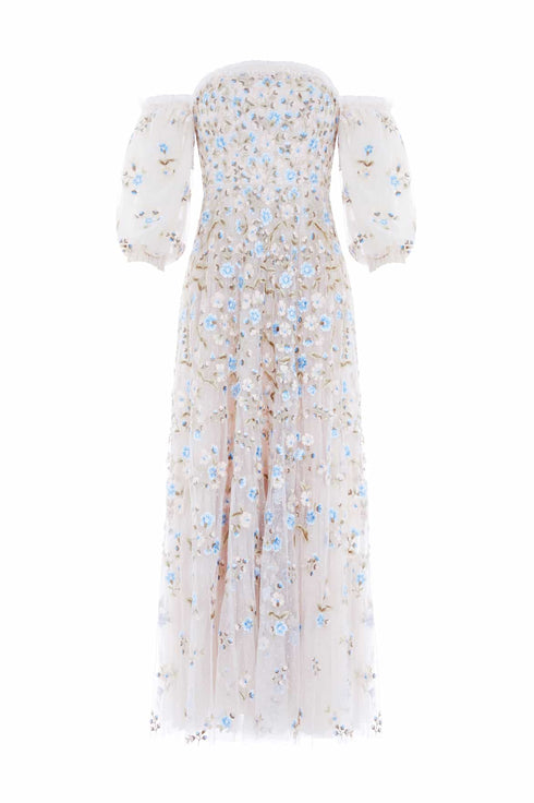 The Posy Pirouette Off-Shoulder Ankle Gown in Cream / Blue. A statement style for the season ahead. This gown is beautifully embroidered with intricate, rich posy florals scattered all-over and dispersing towards the hem. Developed with an off-the-shoulder design and adorned with soft, tulle ruffles adding a romantic finish. The sleeves are crafted using layers of tulle net for a more structured look. Crafted with a net tulle generous skirt with a sweeping hemline. A traditional yet stylish gown.