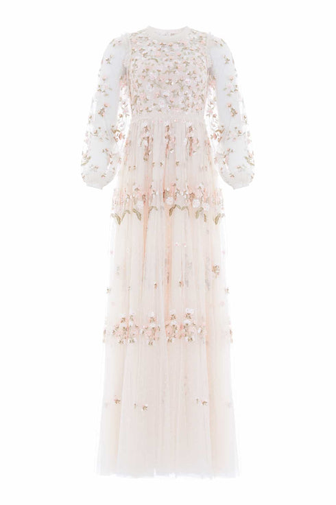 The Posy Round Neck Gown in Cream. This statement dress is adorned beautifully with intricate embroidered floral bouquet motifs and shimmering sequins, creating an all-over glistening effect. The skirt is developed with layers of soft, delicate tulle and net for a romantic texture. Make this style your new wardrobe staple.