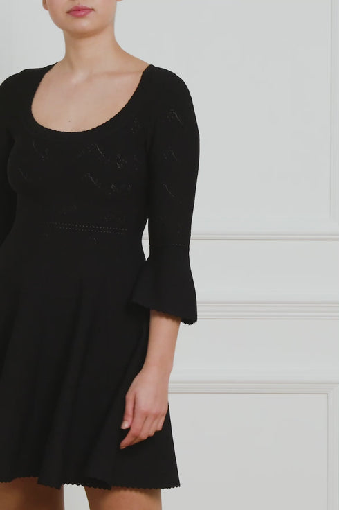 The Pretty Pointelle Knit Scoop Neck Mini Dress in Black. A brand new style for Needle & Thread. This knitted dress is inspired by vintage ditsy florals and lace. Beautifully designed with all-over pretty pointelle stitch, delicate florals and scallop details. This dress has a fitted stretch bodice with a soft, feminine neckline, fluted cuffs and signature Needle & Thread detailing. A truly flattering piece.