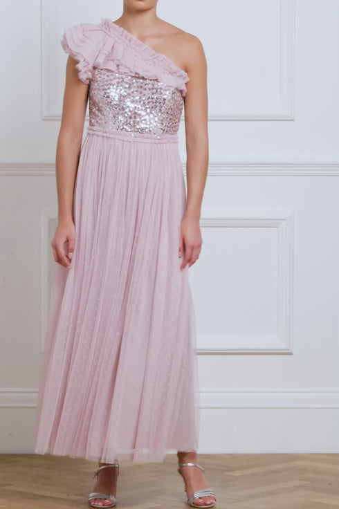 The Raindrop Bodice One Shoulder Ankle Gown in Sunflower. This bodice of this gown is beautifully adorned with an enchanting sequin artwork. The artwork is designed with delicate shimmering polka dot sequins in a linear formation capturing the essence of glistening raindrops. Designed with an off-the-shoulder style for elegant detailing. The skirt is made from layers of frothy tulle featuring statement frill details, creating a signature romantic look. The gown is perfect for a bridesmaid moment or an upcoming special event.