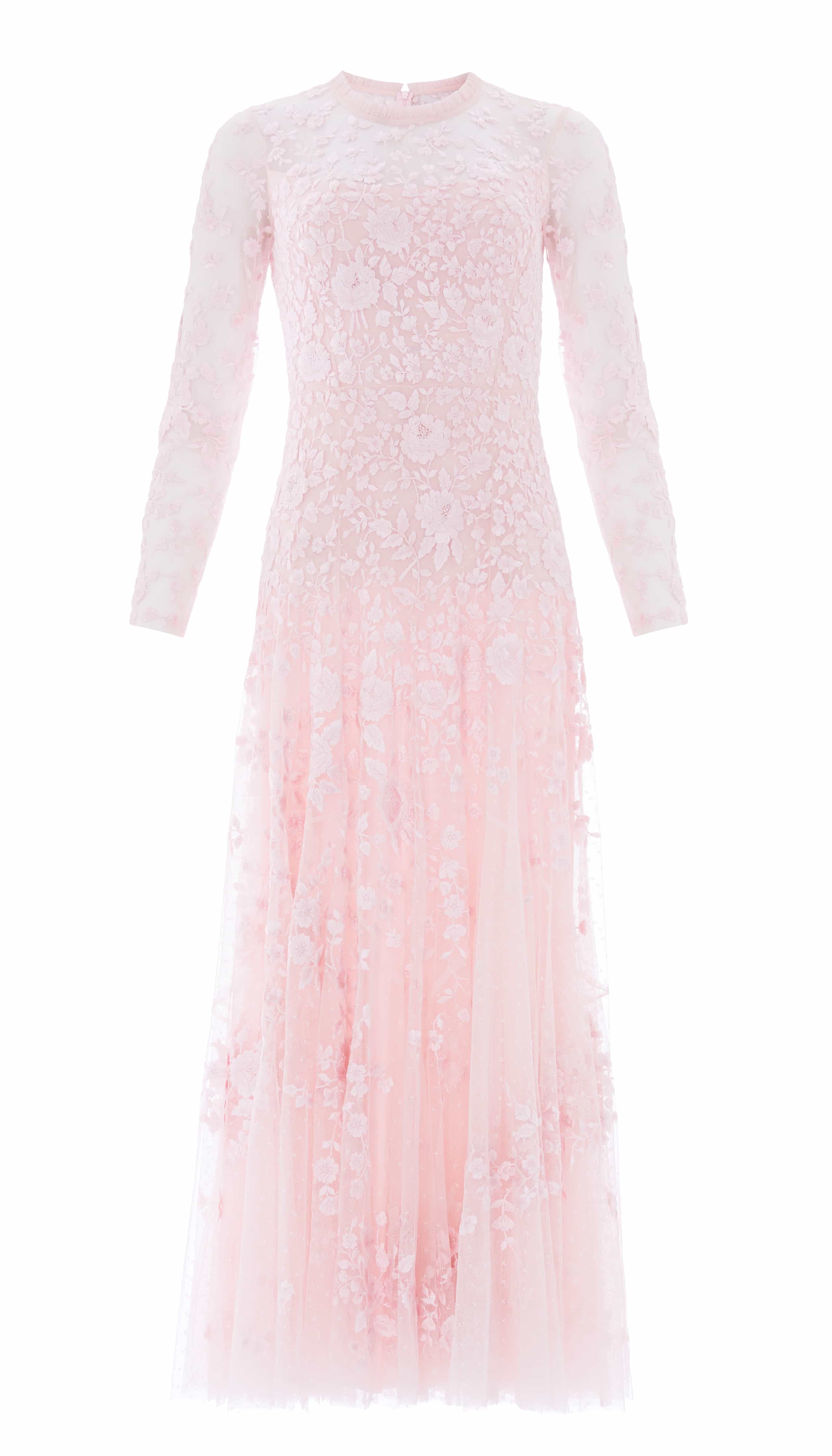 NEW SEASON. The Rosa Round Neck Ankle Gown in Peony Pink. This romantic gown is adorned with signature floral embroidery inspired by painted English gardens. Finished with a round neckline and flowing ankle-length silhouette for effortless elegance.